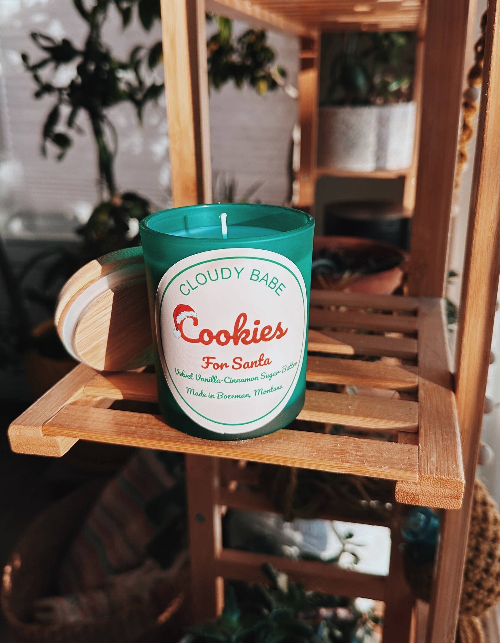 Cookies for Santa! A delicious blend of velvet vanilla, cinnamon sugar, and brown sugar butter. Smells just like a warm Christmas cookie! This candle is hand poured by myself, near the mountains of Yellowstone, Montana. Made of an organic soy-coconut blend wax. Non-toxic. Infused with natural essential oils. Pet safe. 8 oz poured into a frosted, forest green glass jar with a bamboo lid.